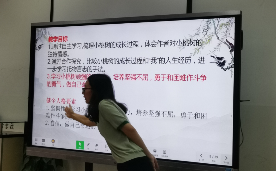 首先,语文组付明老师就如何形成《一颗小桃树》健全人格展示课例进行了分享。《一棵小桃树》是贾平凹的一篇散文。本篇文章讲述了作者的长大和小桃树的成长,反映出了作者的迷茫和在探索中成长的心路历程。付老师从上好一堂基于健全人格培养的德育特色语文优课出发,结合语文学科核心素养和课题研究的角度进行了教材的挖掘。作者笔下的桃树就是他本人的化身。从明——小桃树,暗——作者两条主线,围绕校本健全人格目标体系中自信、坚韧性两个要素。结合初一学生阅读缺乏技巧的学情,在语文组课题专题研究会上进行了说课和教学思路分享,全体语文组老师在宋扬组长的带领下,积极给付老师出谋划策,经过多次磨课后,最终形成了较为成熟的教学设计。