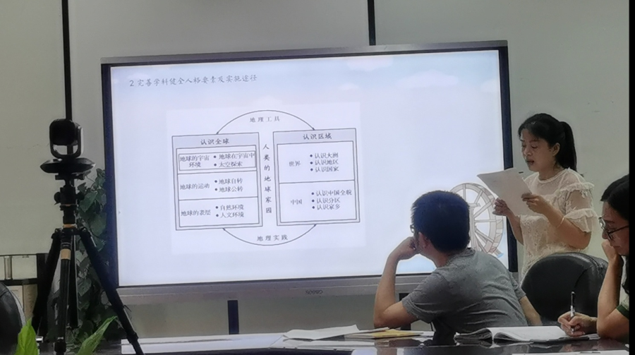 地理组的分享也同样精彩。主研人员刘英老师,展示了地理组在实践中寻找到的“以课题研究优化学科课堂”路径。地理组在实践研究中首先寻找学科核心素养与健全人格教育的有机联系。抓住学科核心素养中环境意识、人地协调、多元、包容、尊重等核心关键词,对应挖掘校本人格目标培养体系中“文明素养-保护自然环境”、“认知-世界观”、“情感-友爱感”等要素与学科间的联系,进行解读。将人格要素融入到具体的每一章节教学内容中去发现契合点,让研究成为优化课堂的手段路径,让老师们在研究中得到育人素养和教学能力的提升,从而主动研究、自觉研究的做法让课题组的老师们深受启发。