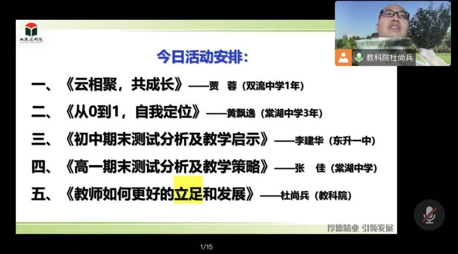 会议第一项由双流中学的贾蓉老师带来的《云相聚,共成长》的汇报交流,贾老师为大家分享了疫情期间如何合理、有效的开展线上教学以及取得的良好效果。会议第二项由棠湖中学的黄飘逸老师带来的《从0到1,自我定位》的汇报交流,黄老师把自己从教3年来的有自信、挫败、彷徨和热爱等点点滴滴做了分享。会议第三项由东升一中的李建华老师带来“初中期末测试分析及教学启示”的汇报交流。会议第四项由棠湖中学的张佳老师带来的“高一期末测试分析及教学策略”。会议最后由双流区教科院初中室主任、生物教研员杜尚兵老师带来的“教师如何更好的立足和发展”专题讲座,杜老师建议大家要做五有老师:心中有爱、眼中有人、手上有活、脚下有风、脑里有法。