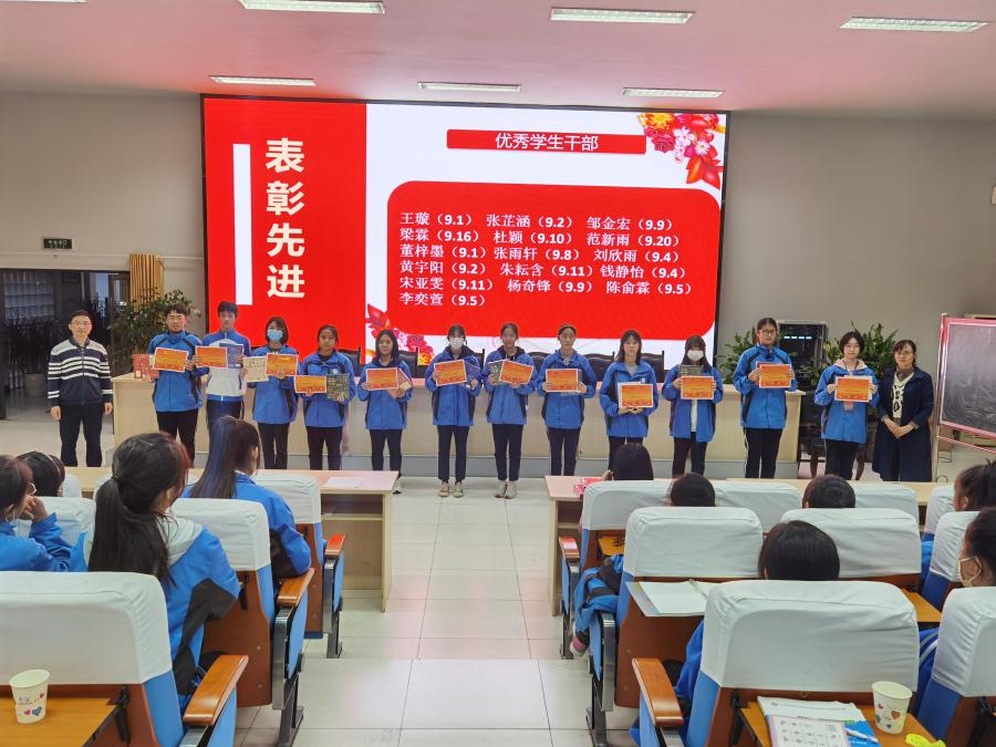 大会议程第一项——表彰先进。学生干部队伍是学校学生工作的重要载体,我校学生干部更是在学习和工作中,成为了学校老师的得力助手,成为了学生中优秀的榜样。在过去的一学年中,我校学生干部围绕学校“四化”办学理念以及《健全人格纲要》课程实施,开展了许多扎实有效的工作,在学生干部梯队建设、学生干部值周、班级文化建设实施、学校运动会志愿服务、小升初以及各项比赛引导、共青团少先队建设等各方面做出了自己应有的贡献,也取得了许多突出的成绩,在团结广大学生、服务学校中心工作、服务学生成长方面发挥着重要作用。同时,我校上一届国旗班队员也出色圆满的完成学校交给的升旗护旗任务,他们用刻苦的训练、飒爽的英姿不仅捍卫了国旗的尊严,也捍卫了学校的荣誉。