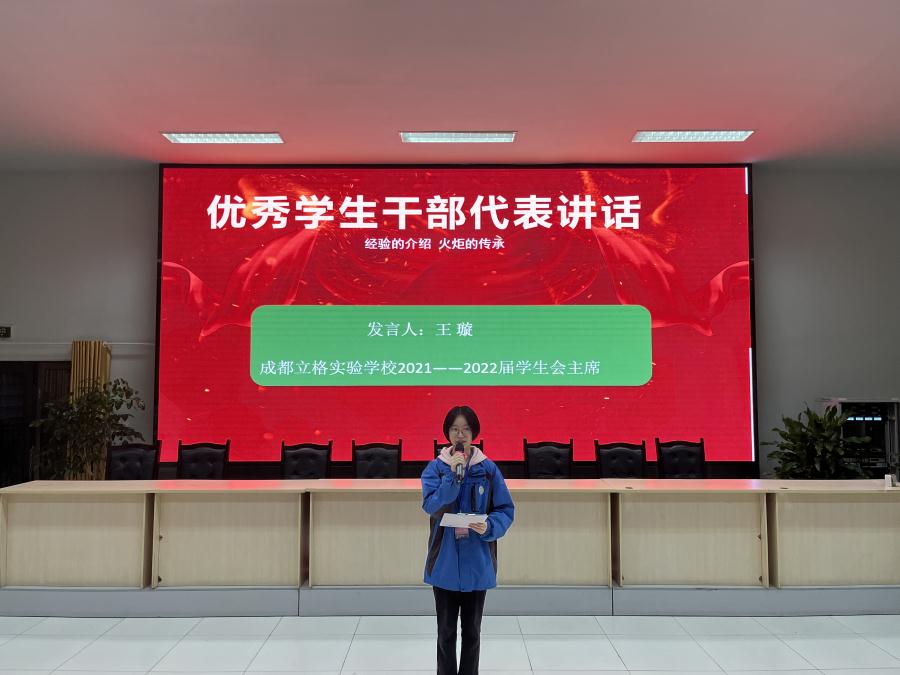 大会议程第二项:在过去的一年中,学生会在成员的共同努力下日趋成熟,此时他们一定有许多经验和记忆,上一届学生干部代表—成都立格实验学校学生会主席王璇同学发言。
