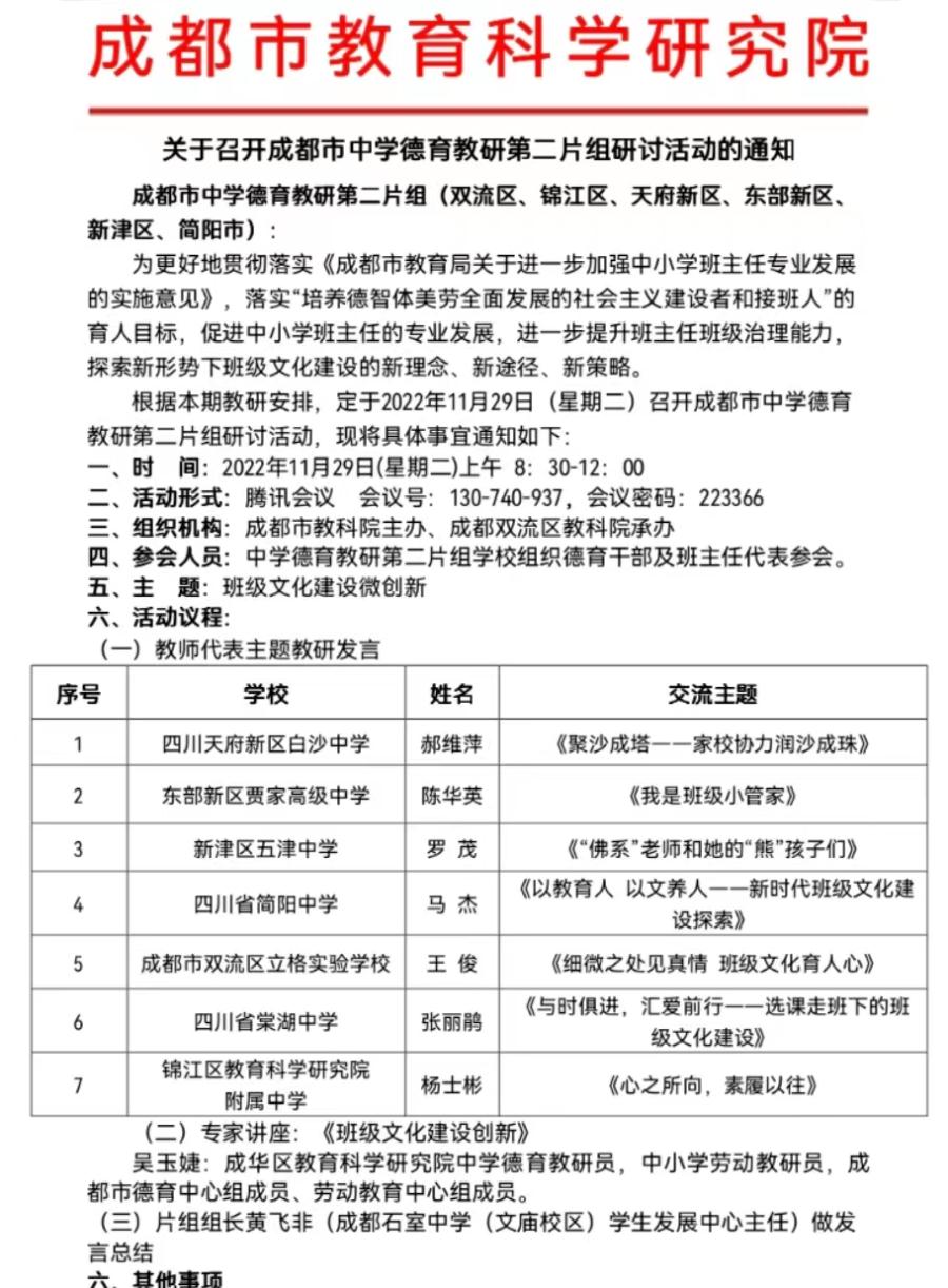 2022年11月29日上午 ,成都市中学德育教研第二片组研讨活动如期召开。此次活动主题为“班级文化建设微创新”,由成都市教科院主办、双流区教科院承办。