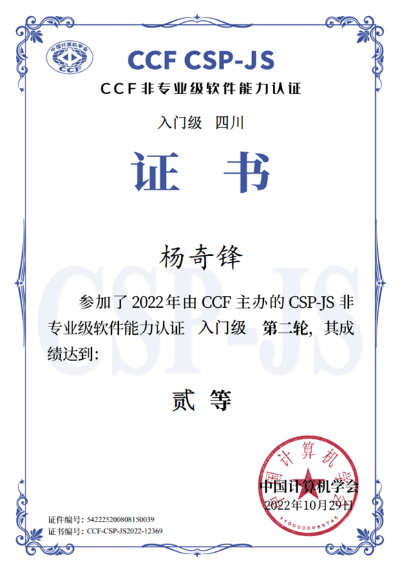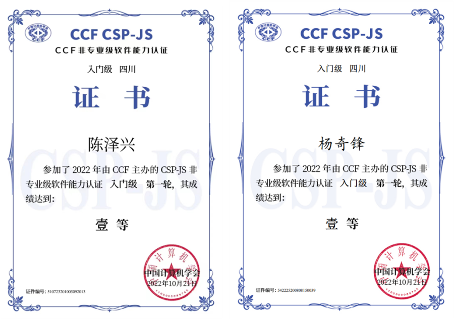 2022年9月—10月,我校学生参加由中国计算机学会组织的CSP2022-JS比赛,共计11人次获奖,参赛学生由我校小学部、初中部和高中部各个年段的学生组成,其中来自七年级11班的陈泽兴和九年级9班的杨奇锋荣获初赛一等奖。杨奇锋同学参加复赛获得二等奖,该同学的成绩也是双流区初中组参加此项比赛中的最高分。