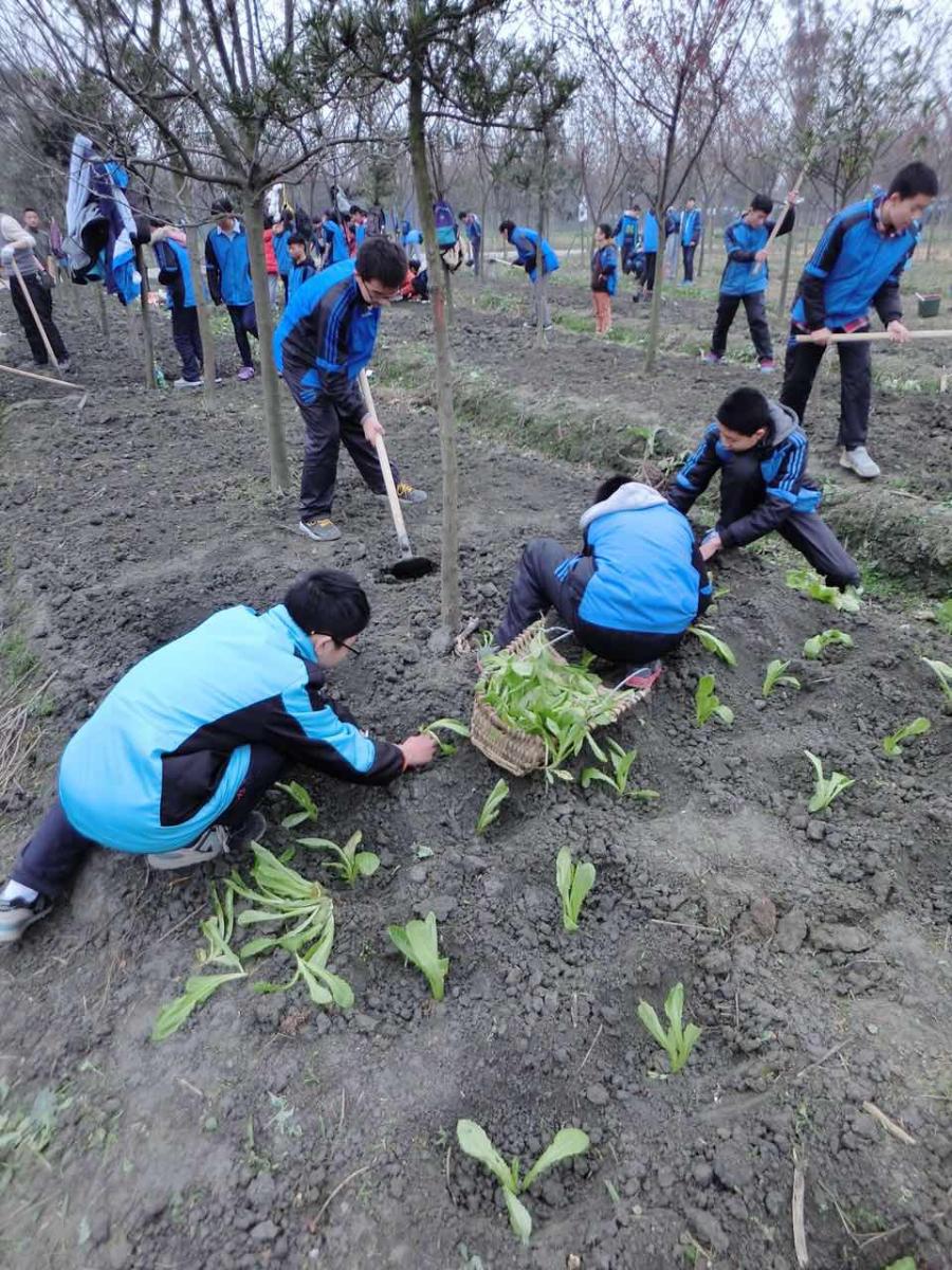 1月5号至1月7号三天下午的1:30~5:30,我校八年级共22个班学生分三批依次到彭镇基地进行了蔬菜种植活动,每个班分六个小组,分别种植了莲花白、莴笋、瓢儿白、包心芥菜、菠菜和生菜。从锄草、翻地平土、量度行距、打窝到直播移栽、培土浇水整个种植活动都是由学生在专业技术人员的指导下完成的。
