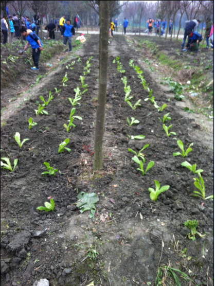 万事俱备,只欠东风。1月5号至1月7号三天下午的四个小时时段,学校八年级共22个班学生分三批前往彭镇基地开展蔬菜种植与研究活动。根据前期学生小组长踩点后所作规划,每个班分六个种植研究小组开展活动。学生们按捺不住激动的心情,在指导教师和小组长的统一安排下,迅速而井然的开展活动。有的小组急忙找地儿把早已设计制作好的组牌挂上,标识出“这是我们的一亩三分地”,有的班级在指导老师的召集下,进行着统一化的操作流程。活动中,领取劳动工具的、领取种子秧苗的、锄草的、翻地平土的、量度行距的、打窝的、直播移栽的、打水的、培土浇水的,分工明细,各施其职,协调合作,秩序井然。坚硬的泥土考验着同学们的意志,也挑战着同学们的极限。有的学生使出了九牛二虎之力也只能翻动地的一点表皮,只能望土兴叹,但有一部分学生却是行家里手,锄头在他们手里上下翻飞,再坚硬的泥土也配合着他们的节奏,开始服软。在这部分行家里手的带动下,越来越多的同学学会了翻地,他们彼此配合,一批接着一批征服土地,用一个小时左右的时间,一片松软的土地呈现在了同学们面前,清香的泥土气息弥漫着整个蔬菜园。孩子们根据前期的技术培训知识,并结合现场交流讨论研究,都力求完美的完成种植的各个流程。这里一群,他们在就种苗埋土埋多厚展开了讨论;那里一堆,他们正为播种后是否要盖土而纠结。 “老师,莲花白的种植窝距要多少合适啊?” “老师,浇水要浇多少才算合适呢?”田间里,只见四个农技员、各班指导老师像消防员一样,在各小组的苗圃间来回穿梭,他们马不停蹄,忙得不亦乐乎。附近路过的农民老大爷也不仅驻足,看着这热火朝天的场面,禁不住挽起裤管走到田间。老人不遗余力的,热情的,耐心的指导着这些不识五谷杂粮的孩子们。他们手把手的教,似乎要把毕生所积累的劳作“秘笈”统统的传给这些孩子们。孩子们也个个认真、专注的学习着,实践着。下午4点左右,在农技员、指导老师和老大爷的指导帮助下,各班陆陆续续完成了自己的种植任务。望着这一块块种植地,有种莲花白的,有种莴笋的,有种菠菜、生菜的。有些行列虽不够整齐,但这埋没不了孩子们第一次真实种植体验的艰辛;有些秧苗偏偏倒倒,但这依然掩盖不了孩子们在合作探究中绽放的青春活力。