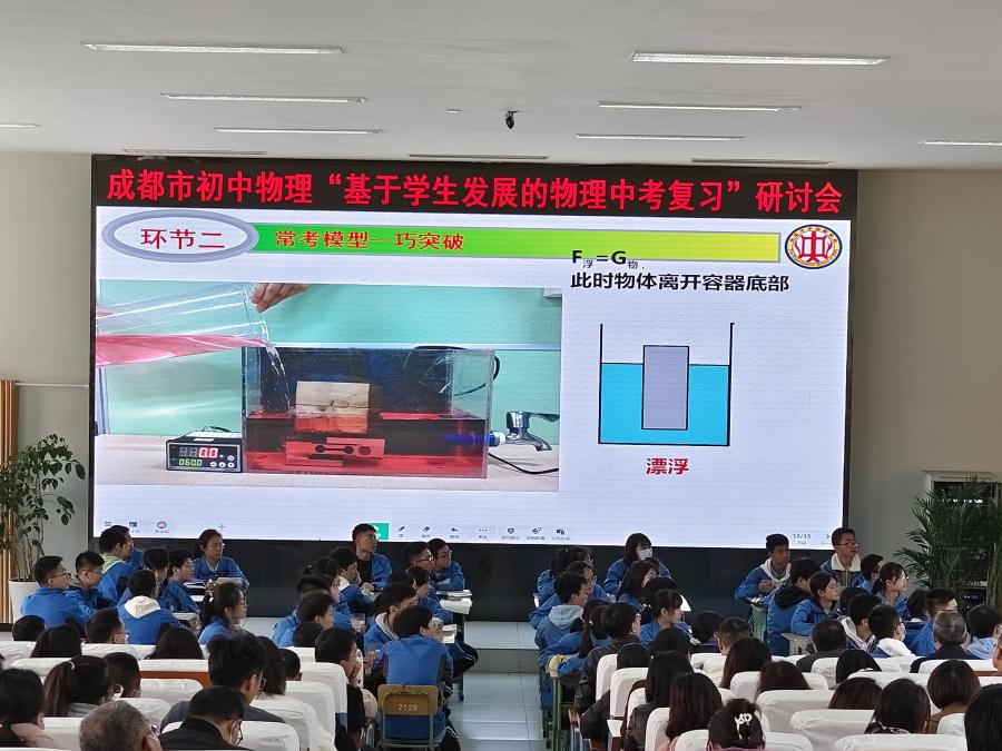 2023年3月16日,成都市初中物理“基于学生发展的物理中考复习”研讨会在我校举行,会议由物理教研组长罗远洋老师主持。我校物理组罗中华老师为莅临我校的成都市各县市区的物理教研员以及各位同仁献上了一堂精彩的复习课《中考复习专题之物体浮沉状态的判断》;刘曦萍老师在会上做了题为《精准定位学生发展内涵,靶向实施物理中考复习》的专题分享,主要分享了我校九年级物理备课组中考复习中的做法和自己的一些看法。