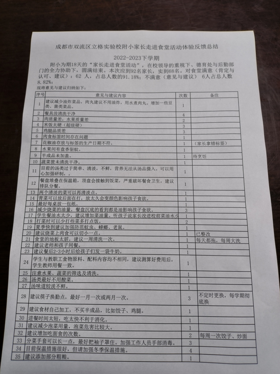 在学校后勤和小学部德育处的共同组织下,60多位小学家委会代表分批参加了“走进食堂”活动。家长们在食堂工作人员的带领下,换上干净的工作服,戴上头套、手套,认真参观了食堂主食库房、副食库房、蔬菜加工间、肉类加工间、操作间,针对家长们在参观时提出的各种问题,食堂管理人员都做了耐心细致的解释。参观完成后,家长们品尝了小学学生餐,并根据参观的情况,对食堂做得好的方面给予了充分肯定,也给食堂工作提出了中肯的建议。学校将根据实际情况,对具有代表性的建议,汇总疏理后,及时做出适当调整。