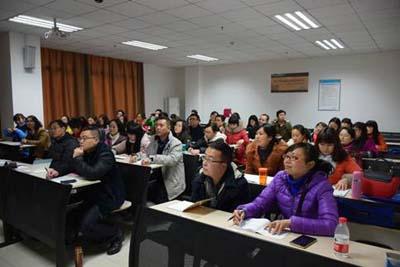 西南大学外国语学院的黄宇教授作了题为《初中英语有效词汇教学策略及教学实践》的讲座。黄教授不时以提问的方式激活大家的思维,鼓励老师们分享在具体教学实践中的所思和所得,真正让老师们带着问题去学习、去思考、去探讨和分享,从而达到完善自身专业知识结构、有效运用于自身教学实践、提高教学效益的目的。
