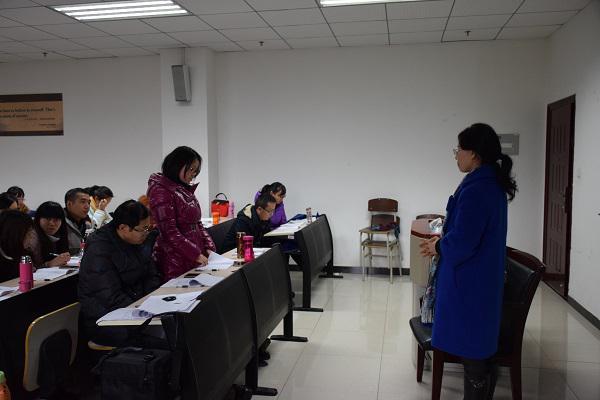 西南大学外国语学院肖丹教授有关阅读课教学设计的专题讲座。肖教授首先让老师们以小组讨论的形式对新目标英语八年级下册《3a-3c of section A, Unit 1 What’s the matter? 》进行了具体的阅读教学设计讨论和同课异构的展示。我校三位学员共同完成的教学设计也与所有学员进行了分享,并获得肖教授的高度赞扬,尤其是我们对教材的理解及结合本校英语教学情况而进行的内容整合。随后,肖教授指出了如何进行有效的说课,即在有限的时间内用简要精确的语言,讲述自己对所教内容的理解,主要突出“教什么”、“怎样教”和“为什么这样教”三个方面。她还讲解了说课的特点和内容,包括说课题,说教材,说教法,说学法,说教学程序及说板书设计,关注有效教学的三个维度(目标有效、过程有效、评价有效)。