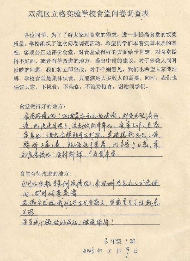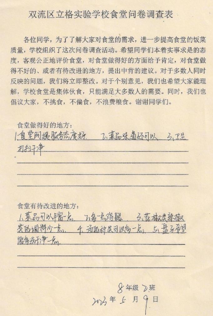 二、八年级同学在认真填写《食堂问卷调查表》。
