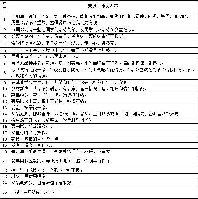 本学期第13周、14周,学校总务处和德育处联合召开了4次初中部学生座谈会,主要目的是倾听来自学生的声音,及时调整学校食堂的配餐工作,尽量满足学生的需求。食堂负责人首先对食堂日常工作进行了简单介绍,包括菜谱的更换、原材料的采购、加工、餐具清洗消毒等。然后,同学们独自认真填写《食堂问卷调查表》,对食堂做得好的方面给与了肯定,同时也对食堂配餐、卫生、菜品味道、服务等方面提出了自己的建议。