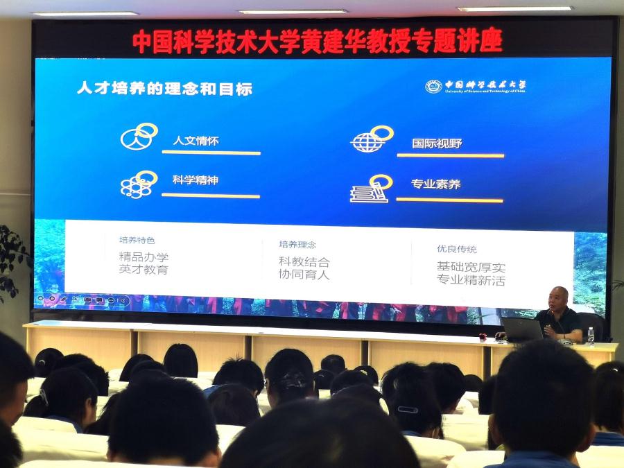黄建华教授从“中国科学技术大学是为‘两弹一星’事业而创办的一所大学”引入,打开了与同学们的交流话题。黄教授全方位阐释了中国科学技术大学创办历史、师资团队、学科特色以及人才培养的理念和目标,特别介绍了科大新医学和科大新工科的特色和概况,以及要成为一名合格的中国科大学子应具备的品质。