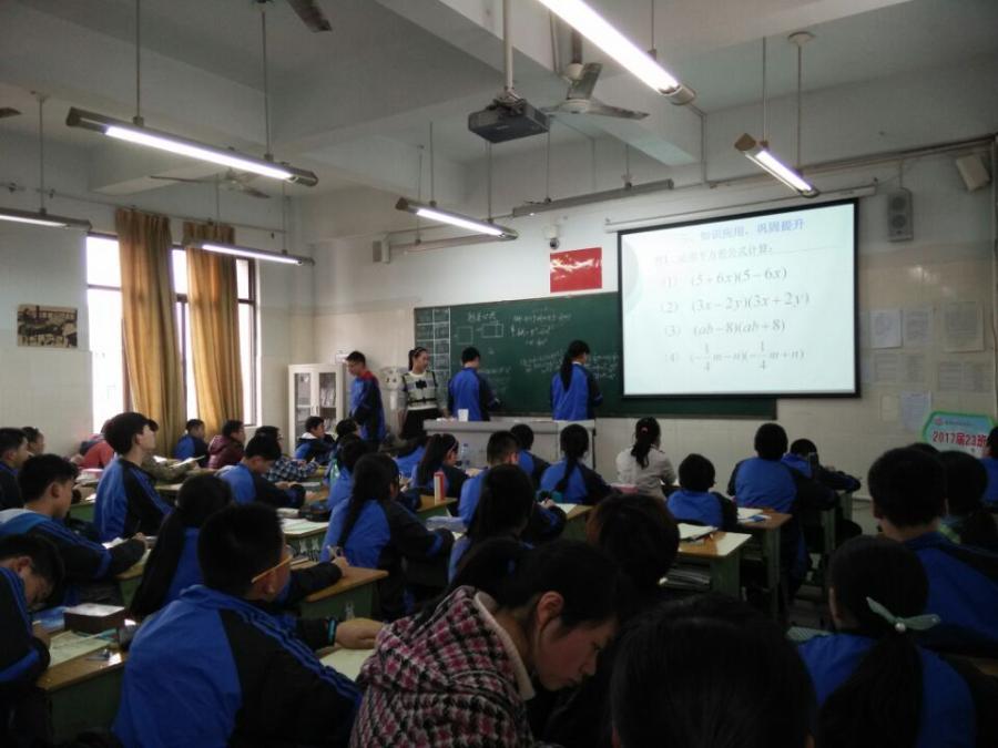 2015年3月17日七年级数学组本学期“人人献课”活动拉开帷幕。首先由肖月季老师给大家展示了一堂精彩的研究课《平方差公式(一)》。肖老师充分结合我校研究的市级课题成果《自主合作探究式课堂教学模式——新授课教学模式》的五环节:“创设情景-发现问题、探究新知-解决问题、知识应用-巩固提升、反思评价-建构新知、拓展延伸-创新实践”,精心设计、灵活组织教学,课堂气氛活跃,学生参与度高,教学效果好,得到了在场教师的一致好评,为数学组的“人人献课”活动开了一个好头,期待后面的老师有更加精彩的表现!