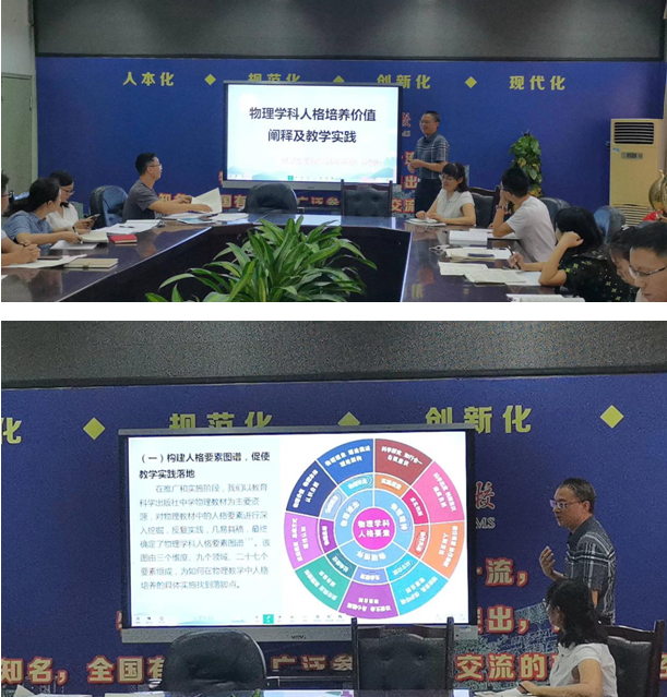 最后,物理教研组组长罗远洋老师做了主题为《物理学科人格培养价值阐释及教学实践》的课题研究成果分享。罗远洋老师分享了物理学科人格培养价值取向、以构建物理学科人格要素图谱为指导的实施策略,通过物理理念的浸染、物理精神的培养以及物理情怀的滋润,潜移默化地进行物理学科人格培养,促使学科健全人格教育实践落到实处。