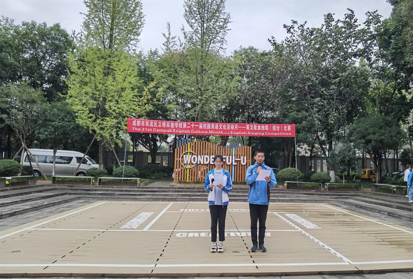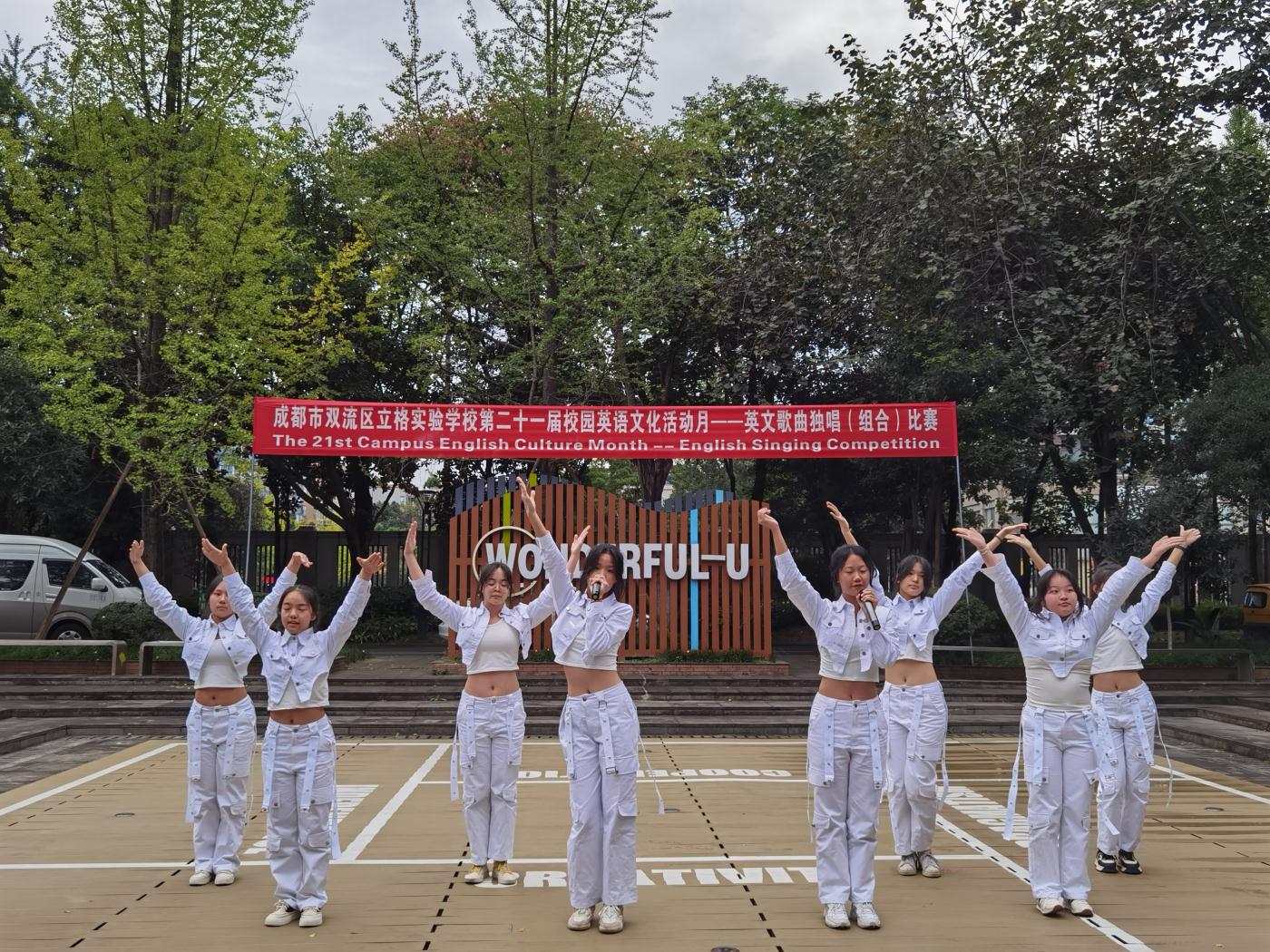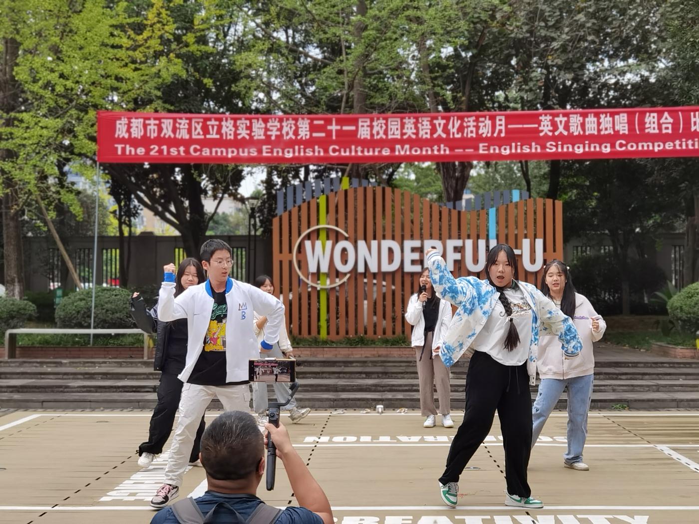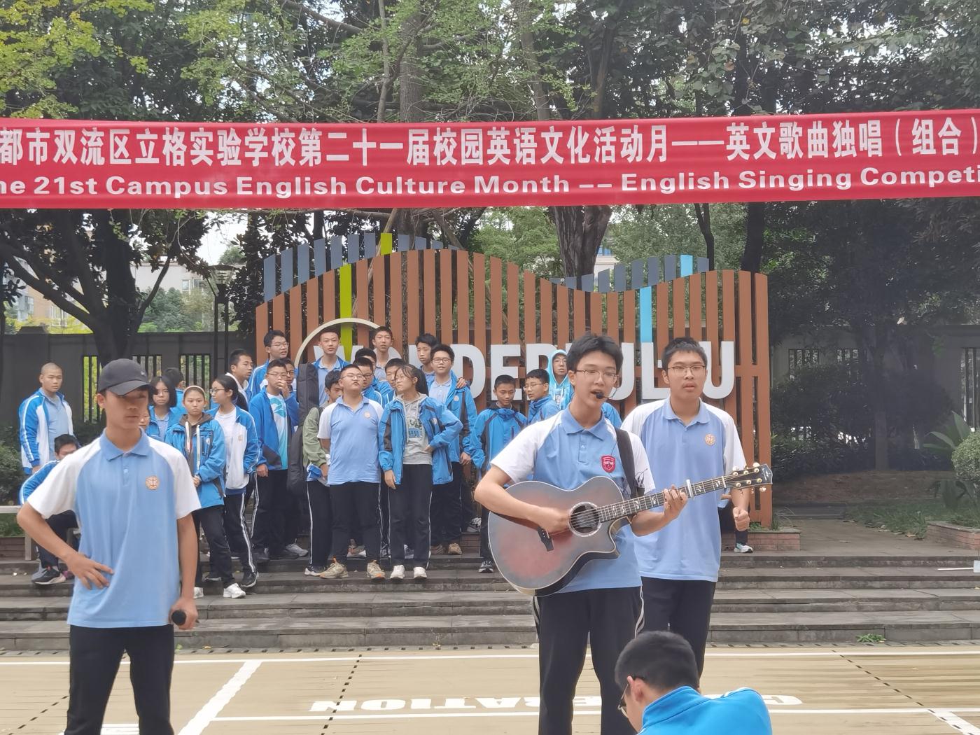 2023年10月19日下午,英语活动月之九年级英语独唱(组合)比赛在英语角小广场举行。本次活动吸引了许多老师和同学现场观看,气氛非常热烈。本次比赛的评委是来自九年级的四名英语老师和外教老师,他们分别根据各班选手的演唱技巧、着装、整体效果等打分。