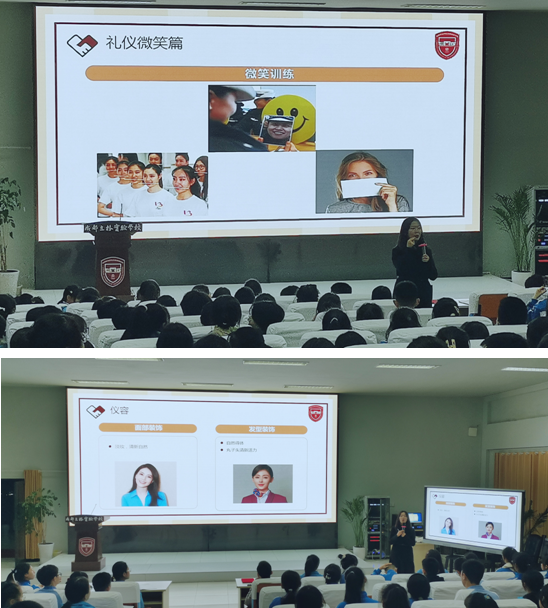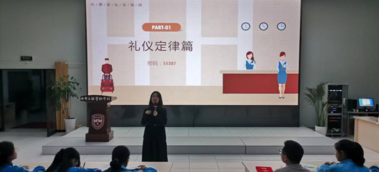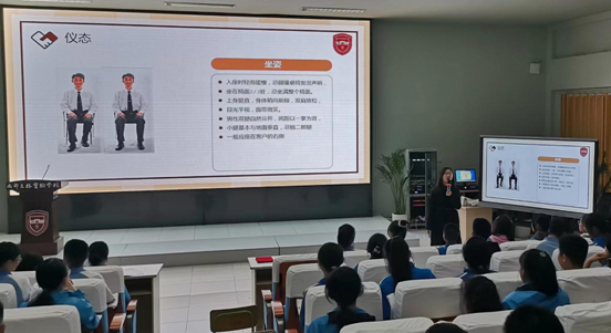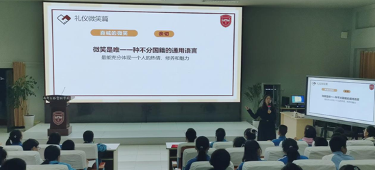 刘老师向同学们介绍了礼仪的相关知识,让同学们了解了礼仪是在特定的场景中,把人内心待人接物的尊敬之情,通过美好的仪表、仪式表达出来的行为规范。刘老师从礼仪微笑、 仪容仪表仪态、 接待礼仪等方面详细解说了接待礼仪内容和要求,并指出了需要注意的细节。