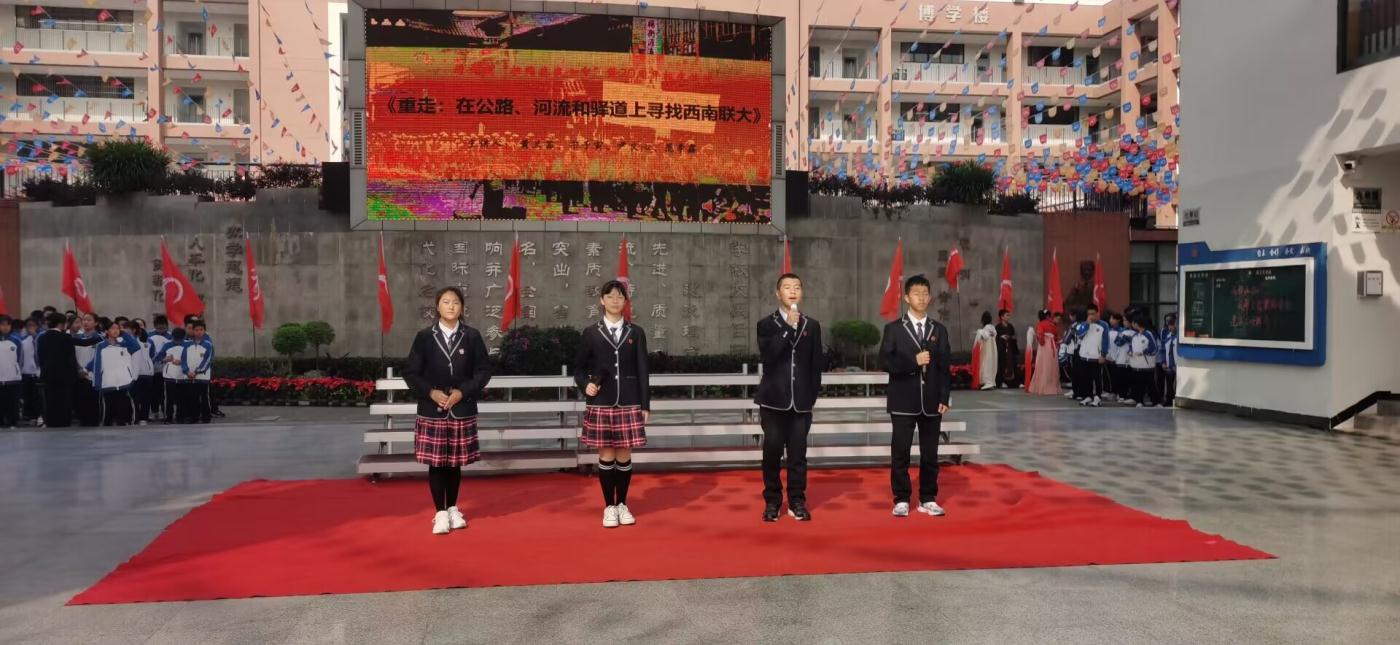太阳门前,黄兰茜、宋子寅、 尹文心、范季鑫四位同学献上《重走:在公路、河流和驿道上寻找“西南联大”,》,他们以西南联大发展历程为素材,讲述了西南联大抗战烽火中的不辍弦歌。在战争风云之下,民族存亡之际,它临时拼凑而成,条件恶劣,衣食不充。虽有日寇轰炸,但他们赓续文文脉,弦歌不辍,书写了中国教育史上的奇迹,西南联大的发展与立格实验20年的奋斗相得益彰,赢得了与会校友的喝彩。