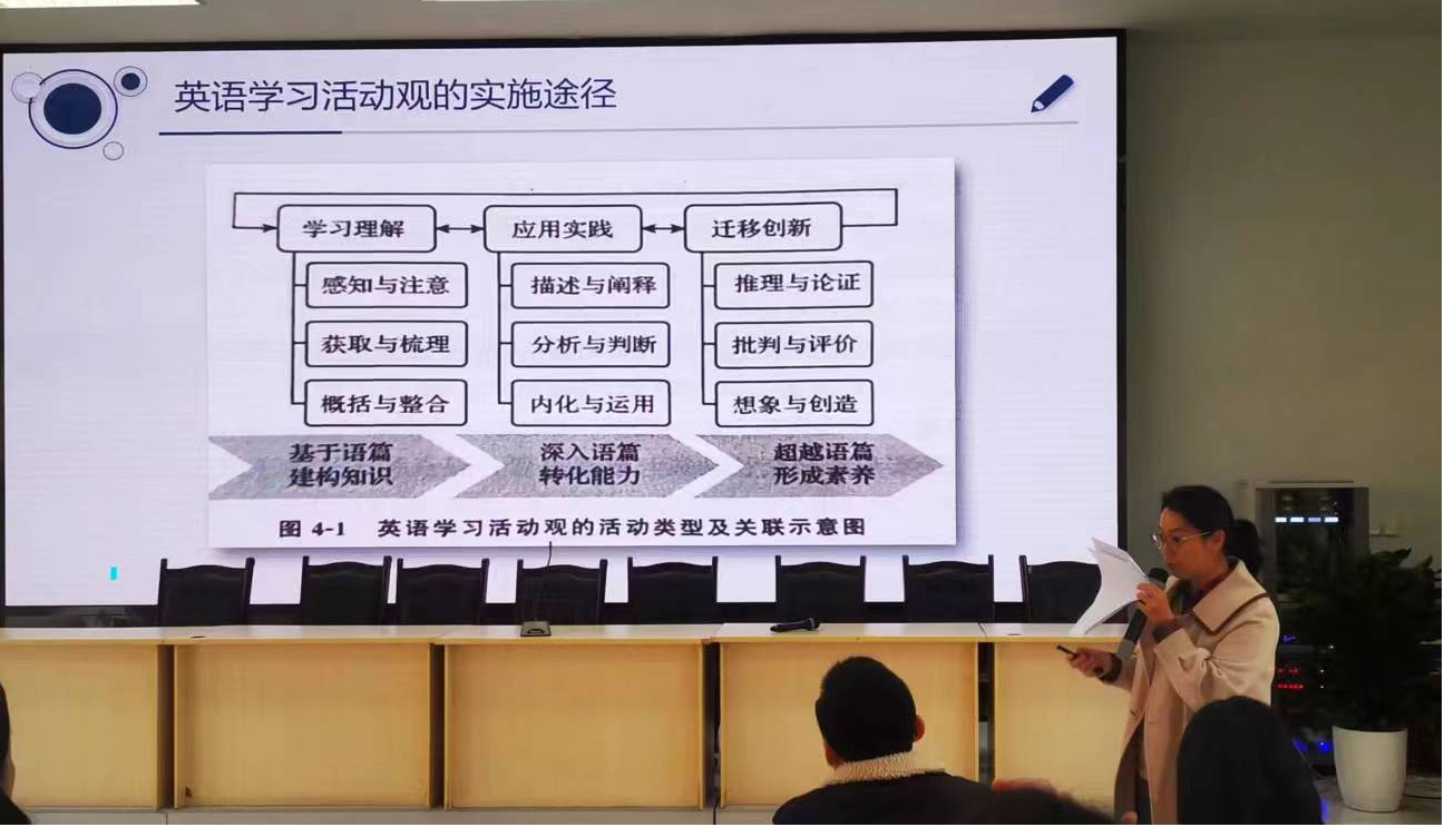 雷翠丽老师发言的主题是“基于英语学习活动观的健全人格研究”。雷老师从英语新课标讲起,英语课程培养学生正确的价值观、发展语言能力,培育文化意识,提升思维品质,提高学习能力,指向个人和社会全面可持续发展,最终塑造健全的人格。再结合新课标提出的英语学习活动观,重点介绍了英语学习活动观的实施路径—学习理解,应用实践,迁移创新,包括基于语篇,深入语篇,超越语篇的活动,帮助学生理解文本字面意思,到理解文本背后含义到最终理解文本价值和情感,形成新的价值判断,课堂设计由易到难,层层递进。