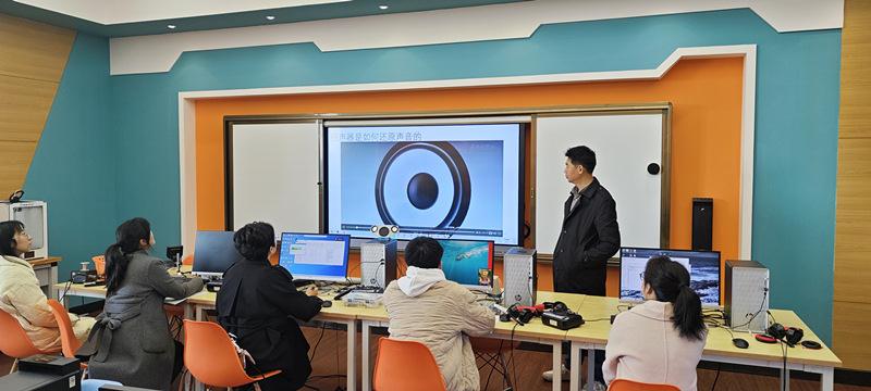 王伟老师先讲解了扬声器发声的原理,让老师们知道什么是声音的频率:单位时间声波振动的次数。了解人耳听觉的频率范围20——20000Hz,知道什么是次声波、什么是超声波。而在真实世界中,我们往往听到的不是某个单一频率的声波,而是不同频率声波的集合,当这个集合有序且和谐,频率稳定,我们可以将这样的定义为乐音,当这个集合混杂而无序,频率随机,我们可以把它叫做噪音。