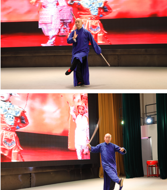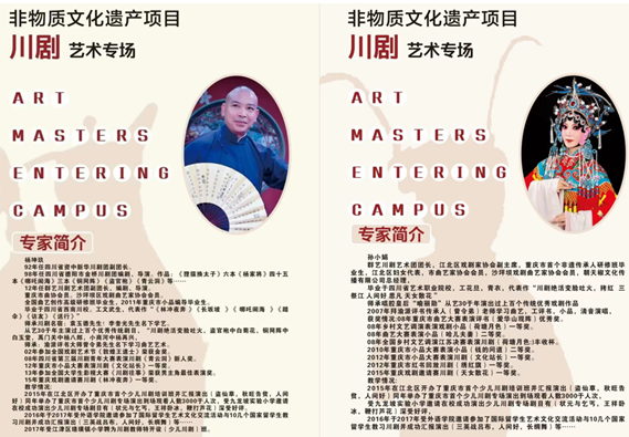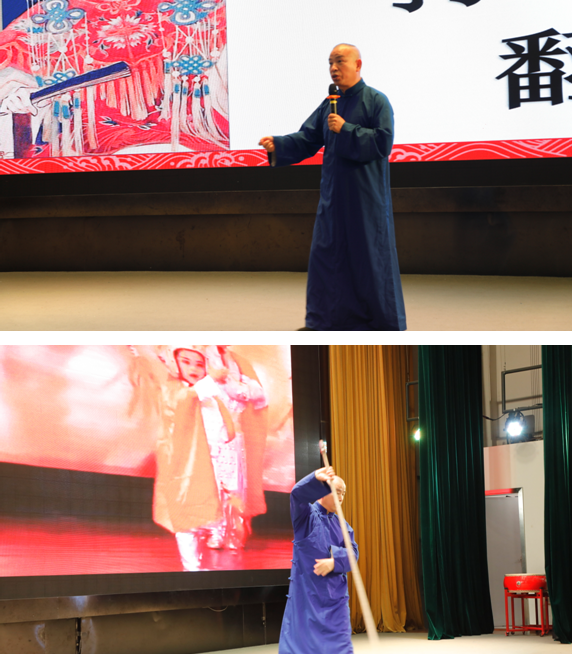 杨坤玖大师首先登场,他用生动有趣的方式向学生普及了川剧的知识。通过杨老师深入浅出的介绍和亲身示范,同学们知道了川剧的五种类别:昆、高、胡、弹、灯;川剧的五种行当:生、旦、净、末、丑;川剧的五个基础:唱、作、念、打、翻;川剧的五种打击乐:小鼓、二鼓、大锣、大钹、小锣;川剧的身法有:手、眼、身、法、步,你、我、来、去、转,天、地、日、月、夜,风、云、雷、雨、雪,山、水、石、鱼、浪,草、木、鸟、花、香;川剧的五大绝技:变脸、吐火、滚灯、打五叉、藏刀等。