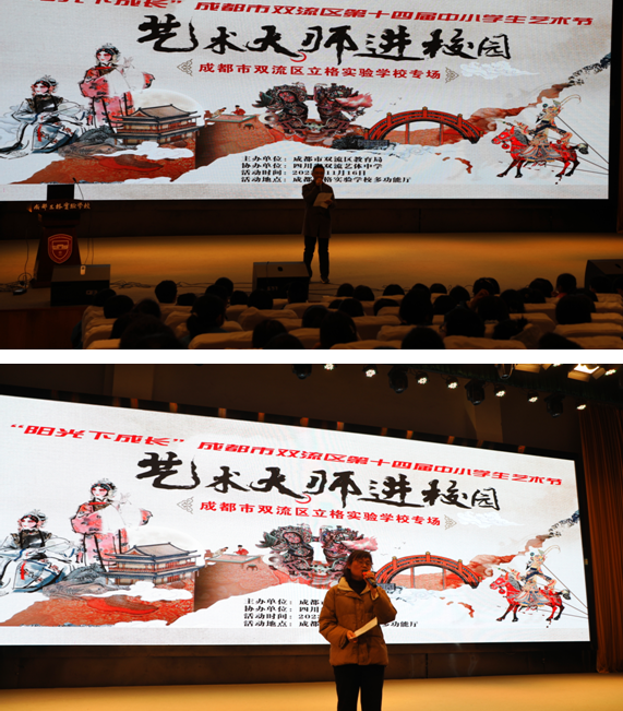 为深入学习贯彻落实党的二十大精神,落实立德树人根本任务,弘扬社会主义核心价值观,植根中华优秀传统文化深厚土壤,引导学生树立正确的审美观念、陶冶健康的审美情趣、培养良好的艺术修养,2023年11月16日下午,成都市双流区教育局组织的“阳光下成长”——成都市双流区第十四届中小学学生艺术节艺术大师进校园活动,走进成都双流立格实验学校。