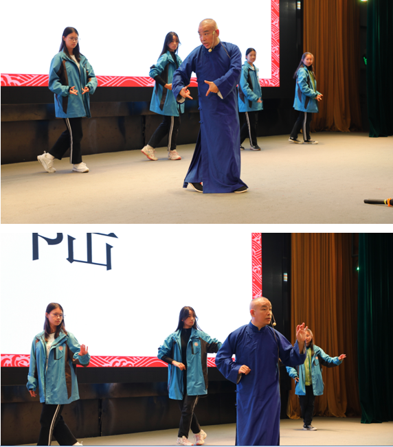 最后,多名同学还走上了舞台,与杨坤玖老师互动,杨坤玖老师示范了川剧中的一些基本技能,引导同学们模仿表演,虽然略显生涩,但同学们的表演仍然赢得了满堂喝彩。通过互动活动,同学们在轻松愉悦的氛围中,不仅体验到了川剧的独特魅力,还领略了中国戏曲的深厚文化底蕴,同时也提高了艺术鉴赏能力和表演自信心!