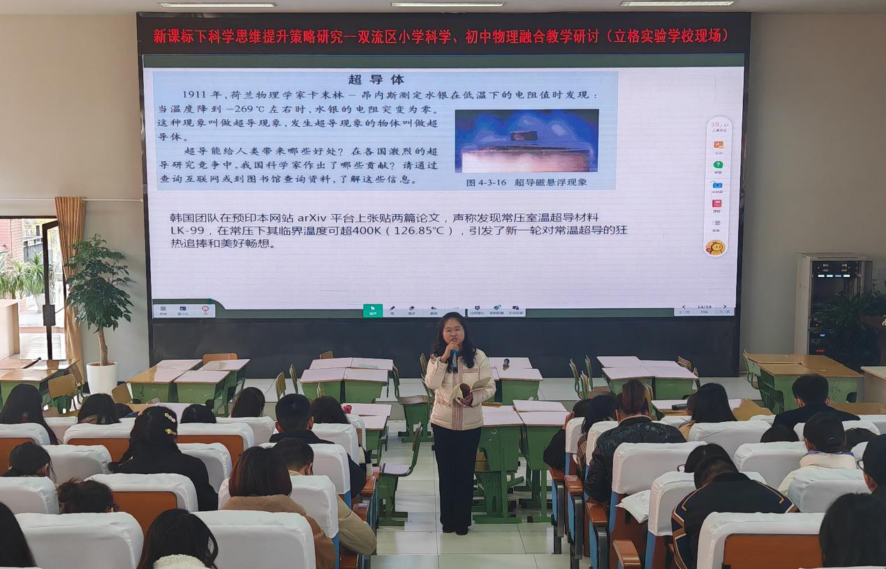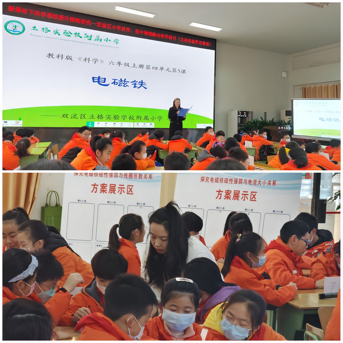 2023年12月7日, 新课标下科学思维提升策略研究——双流区小学科学、初中物理融合教学研讨会在我校举行;通过小学科学和初中物理教材中的《电磁铁》进行同课异构;双流区初中物理教研员韩军以及小学科学教研员周玉全程参与并作了指导。