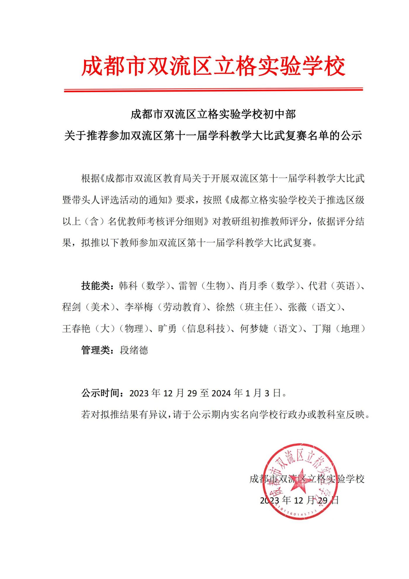成都市双流区立格实验学校初中部关于推荐参加双流区第十一届学科教学大比武复赛名单的公示