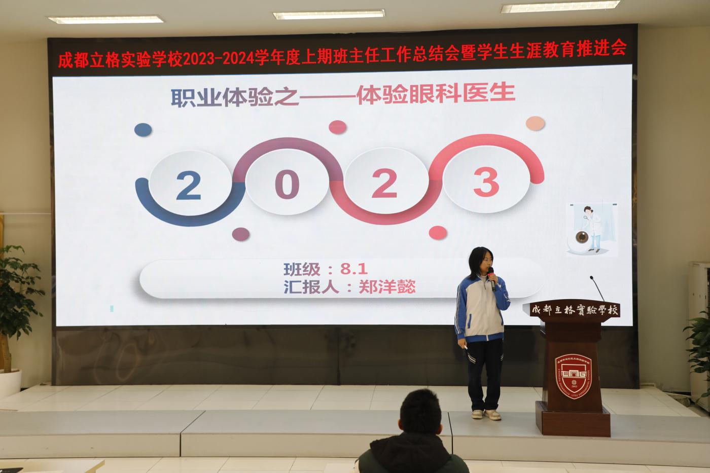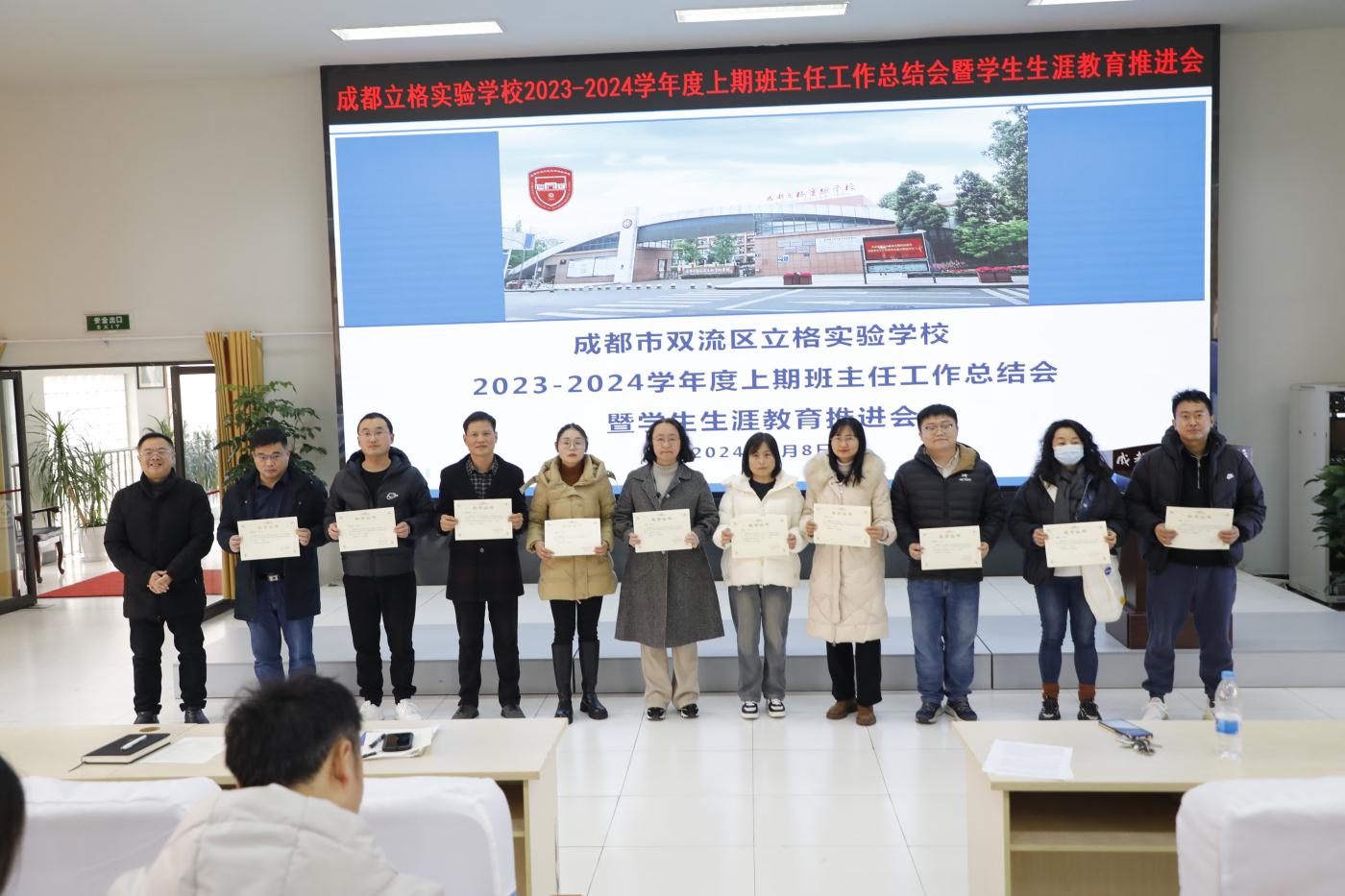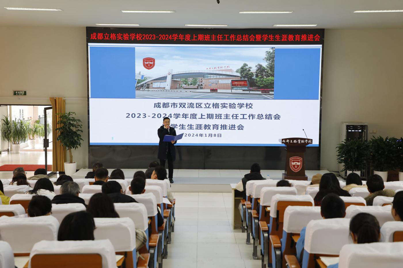 成都立格实验学校于2024年1月8日举办了一场别开生面的班主任工作总结会暨生涯教育推进会。会议旨在落实立德树人根本任务,搭建互相学习、共同提高的交流平台,促进班主任教师和导师队伍的专业成长,推动我校生涯规划工作,增强我校德育工作实效性。本次会议由德育处主任助理王俊老师全程主持。