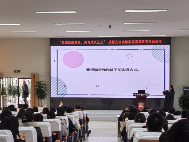 2024年1月23日下午,我校200多名八年级部分学生家长在学术厅参加了一场生动的家庭教育专题讲座。本次讲座由立格实验学校德育处组织,邀请了双流区家庭教育讲师团讲师——向婷婷老师为嘉宾,进行了《聚焦有效亲子沟通,构建和睦亲子关系》的专题讲座。向婷婷老师是西南大学心理学硕士,国家二级心理咨询师,成都市心理健康教育A证学员,双流区人民检察院心理顾问,双流艺体中学心理健康教育教师。