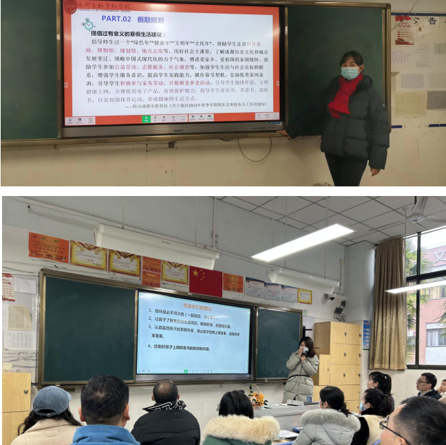 家长们用热烈的掌声表达了对向老师的感谢,并返回班级教室,与孩子共同参加了期末班级家长会。各班班主任和学科教师从班级学期表现及表彰、寒假孩子学习和生活建议,假期安全,假期亲子沟通、关注孩子心理健康等方面进行了沟通交流。
