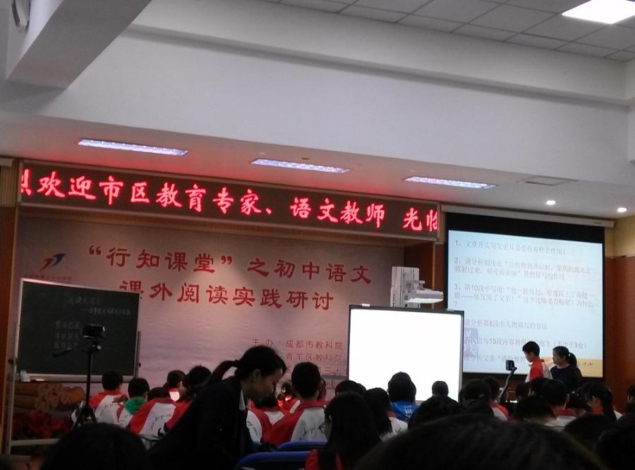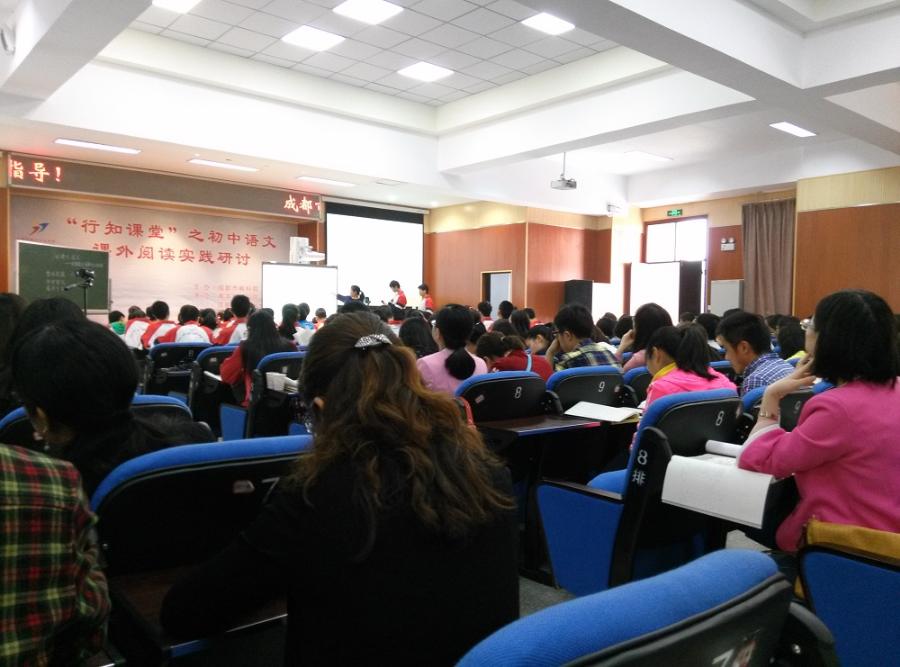 4月16日上午,我校语文组梁卓恒、张柔老师积极参加在成都市第三十七中学举行的“行知课堂”之初中语文课外阅读实践研讨。活动由成都市教科院主办,成都市青羊区教科院和成都市第三十七中学承办,全市各兄弟学校老师参加。程静老师做开场主持,张勍老师上了一堂课外阅读示范课《阅读大闯关》,主要针对学生课外叙事散文阅读能力展示与强化进行了研讨。接下来,徐雯老师就学生学习课外说理散文阅读方法及运用上了另一堂示范课《读懂散文中的“理”》,赢得了在场许多老师的赞赏。之后由蒋友谊校长做了学校情况介绍,张莉老师用生动幽默语言进行了专题交流《行知课堂之初中语文课外阅读实践应用》,让在场老师们接受了一次专业知识的研讨与洗礼。在后来的评课环节,大家与戴宏老师积极交流,我校老师与其他兄弟学校老师们相互交流,纷纷谈出自己的观点和认识,取得非常良好的教研效果。(语文组 田海明)