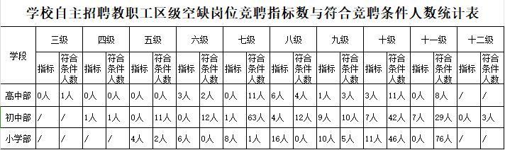 五、体制外自主招聘教职工区级空缺岗位竞聘工作:1.上周学校按照区教育局空缺岗位竞聘工作的相关文件精神开展了区级空缺岗位指标和符合竞聘条件人数的清理工作(后附空缺岗位指标数与符合竞聘条件人数统计表),本周学校按照学校区级空缺岗位竞聘方案规定的打分排序办法(教龄、校龄、任职年限三项之和列前者优先)开展打分排序工作,下周请符合竞聘条件的教职工到档案室开展核分工作。