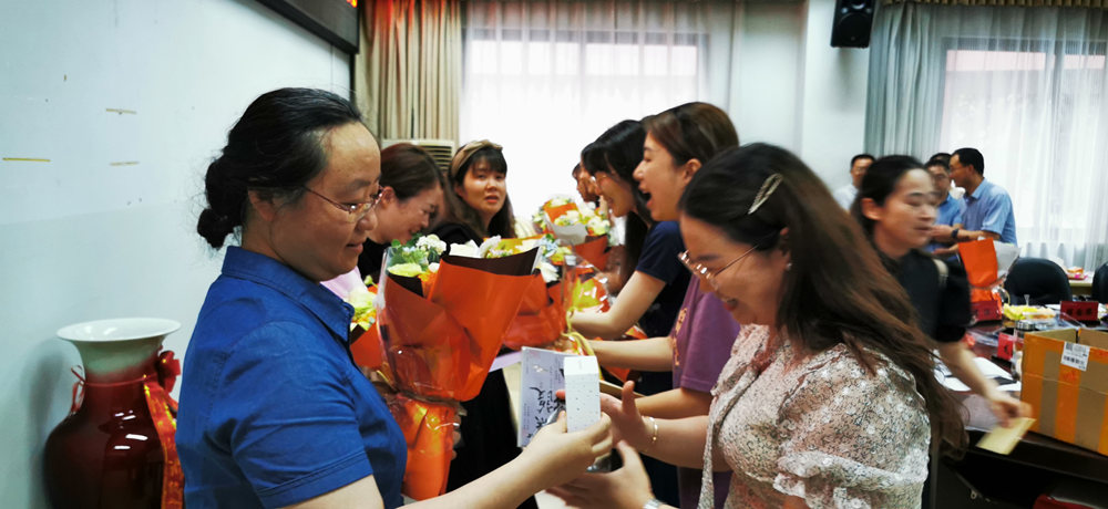 新老师们的分享让在场的师父们倍感欣慰和幸福,语文组干敏教师作为师父代表向新老师们的快速成长表示欣慰和祝贺。她鼓励新老师们卸下包袱、大胆创新,表扬新教师们勤于思考、勇于担当。其后,14对师徒互赠纪念品,徒弟给师父送上鲜花,感谢师父悉心指导,并合影留念。