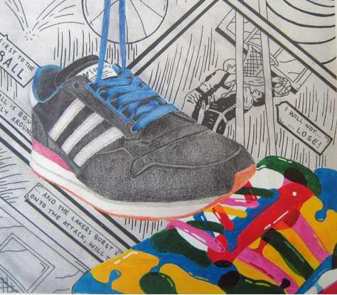 This piece was produced by a 15 year old student interested in sport, photo realistic Art and trainers.