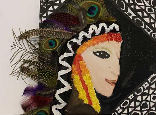 This piece is by a 13 year old student interested in fusing ideas from Native American Art with African Art.