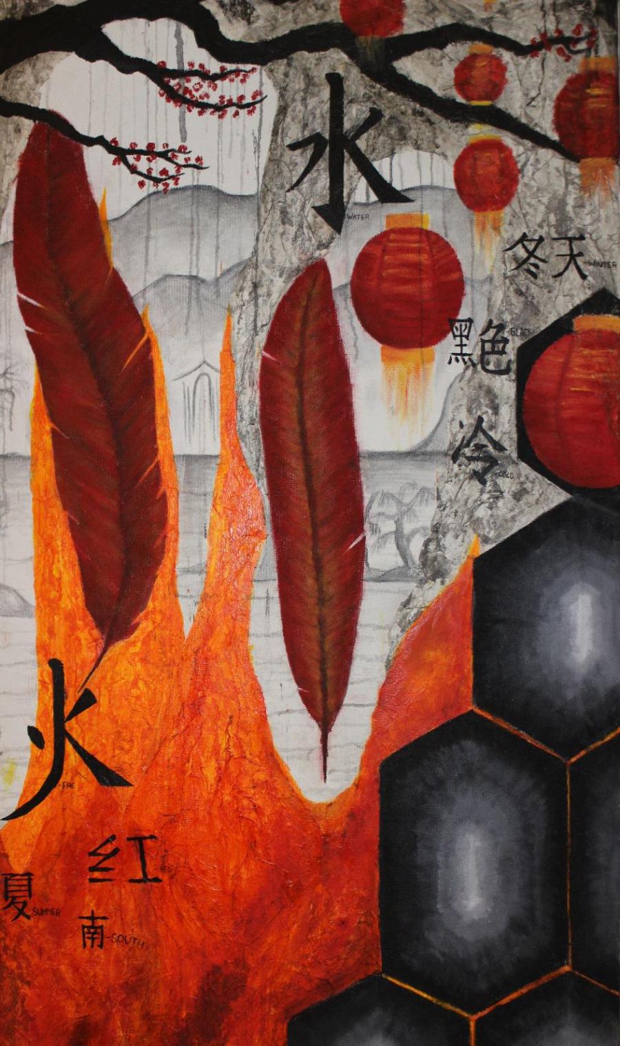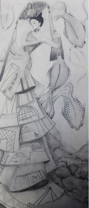 Here the student looks at modern and ancient Asian cultures placing the modernity within the dress and the more traditional scroll landscapes in the background