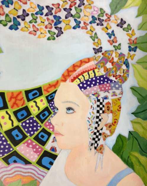 This fun, quirky illustrative painting has been inspired by the patterns in a kaleidoscope, colour and repetition. Painted onto wood panels, the student produced a series of her friends, stylised in this way.