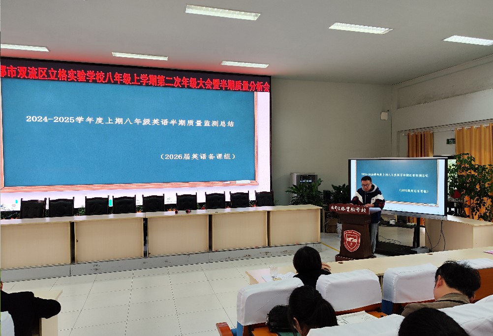 2024年11月22日下午,我校八年级年级组在学术厅召开了以“析得失,明方向,行致远”为主题的半期总结会。成都立格实验教育集团外事部部长、八年级主管行政杨红,教科室主任文传福,教务处副主任本成军出席会议,本次年级大会由本成军老师主持。