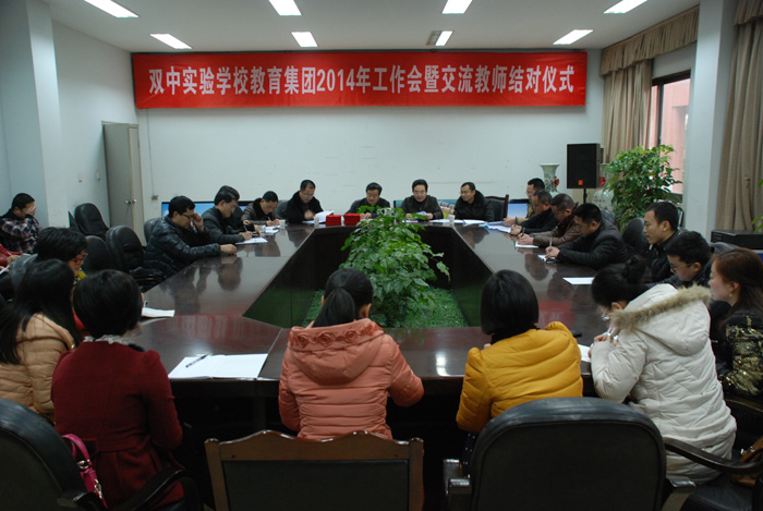 02月27日,双中实验学校教育集团2014年工作会在双中实验学校第三会议室举行,双中实验学校、九江初中、彭镇初中、华阳二中、黄龙溪学校的领导和交流结对教师参加了会议,双中实验学校张润林副校长主持会议。