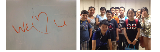 临别之时,初中学生在白板上画了一个大大的心并留言,在我的T-shirt上签名,小学生将自己所画的画送给我们作为礼物,而且纷纷用中文表达感激,告别。