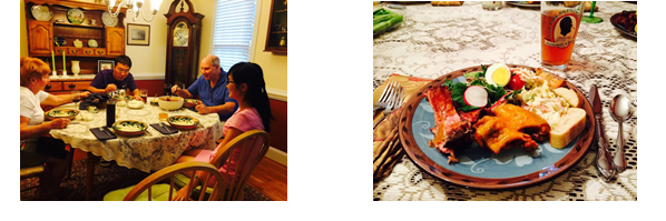 清楚地记得7月18日下午70多岁的Honey和John驱车近半小时到营地将我们的行李接回家。在接下来的两周多时间里,John每天早上都最早起床给我们准备丰盛的早餐。他们给我们准备的晚餐几乎从未重样过。 在YMCA的一周里,Honey每天驱车近半个小时接送我们上班并为我们准备午餐便当。每周周日都会带我们去他们常去的餐馆用早餐。临别时还驱车近三个小时带我们去海滩游玩、吃海鲜。最难忘的是Honey的homemade strawberry jam和jello.