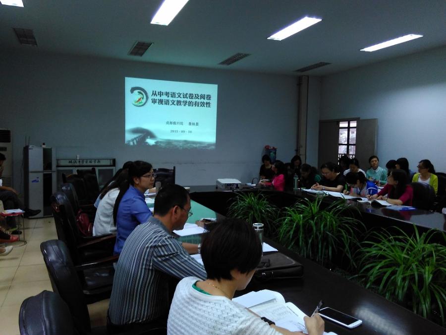 9月10日,成都市语文教研员黎秉晨老师莅临我校,在学校第三会议室进行2015年语文中考分析,学校张校长、全体语文教研组教师与会听取了讲座。