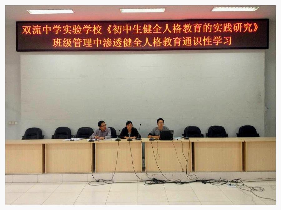 教育的目的,是培养“人”,是让一个“人”拥有更为健全的人格,拥有思考问题、判断问题、处理问题的能力,教育的目的是要一个“人”成为更为完美、更为丰富的“人”而不是其他。基于此,随着我校《初中生健全人格教育的实践研究》的进一步推进,我校“构建以健全人格为核心,全员参与的德育课程化体系”相关工作也将进入一个新的阶段。2015年9月25日下午五时由我校德育处主办,德育处副主任王敏蓉主讲的双流中学实验学校《初中生健全人格教育的实践研究》班级管理中渗透健全人格教育通识性学习会在我校学术演讲厅举行。