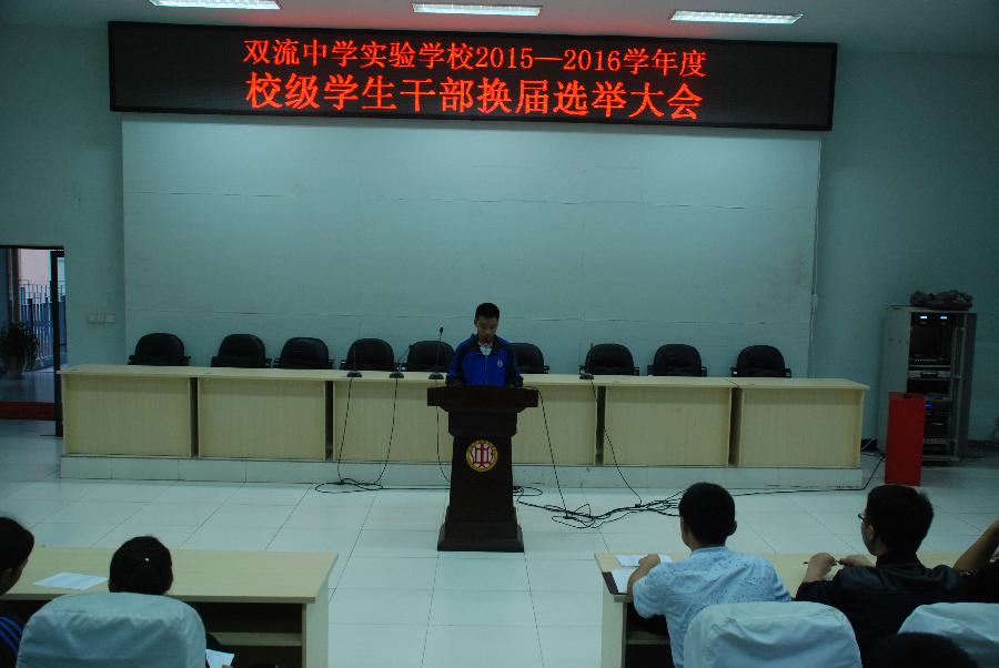 2015年9月29日晚6:20,我校在学术演讲厅举行了2015—2016学年度校学生干部换届选举大会本次大会的评审团由德育处王敏蓉副主任、学生工作组王俊老师、刘家佚老师、黄德洪老师和吴益锋老师以及七八九年级校级学生干部组成。此次大会,全程秉承着“公平竞争,德才兼备”的原则。整个选举过程庄严肃穆,评审员都十分认真专注的评分。