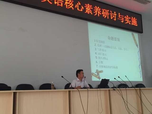 本周二(9月15日)双流县初中英语教研会在我校隆重召开。会议由县教研员程德金老师主持。我校八年级备课组长,初中英语中心组成员谭虹涛老师以“初中英语试题中常见题型命制的方法与技巧” 为主题做了专题讲座。谭老师运用培训所学,结合自己在教学工作中的反思与总结,在本次会议中就“命题总体设计思路、双向细目表、听读写题型的命题技巧与方法、数据分析及考试报告撰写等”五大方面,详细的向全县英语老师详细介绍了初中英语命制的过程,重点介绍了常见题型的命制方法与技巧。在本次讲座中,谭老师用通俗易懂的语言,详细介绍了国际最先进的以“证据为中心”( evidence-centered design)的试题命制思路,同时理论联系实际地引导大家去鉴赏全国中考试题,体会如何命制好一套中考试题方法。谭老师的讲座在会上得到了程老师和与会老师们的一致认可与赞赏。程老师在随后的会中布置了本学期各个年级的中心工作,强调了培养学生的核心素养,尤其是语音朗读能力的培养。在会末,程老师通报了全县期末统考成绩,在统计数据中,我校七八年级各项数据名列第一,凸显名校的风采。这份成绩凝聚了我校英语老师的辛勤劳动。大家坚信在我们共同努力下,我们将继续书写更多的辉煌!(英语组 谭虹涛)