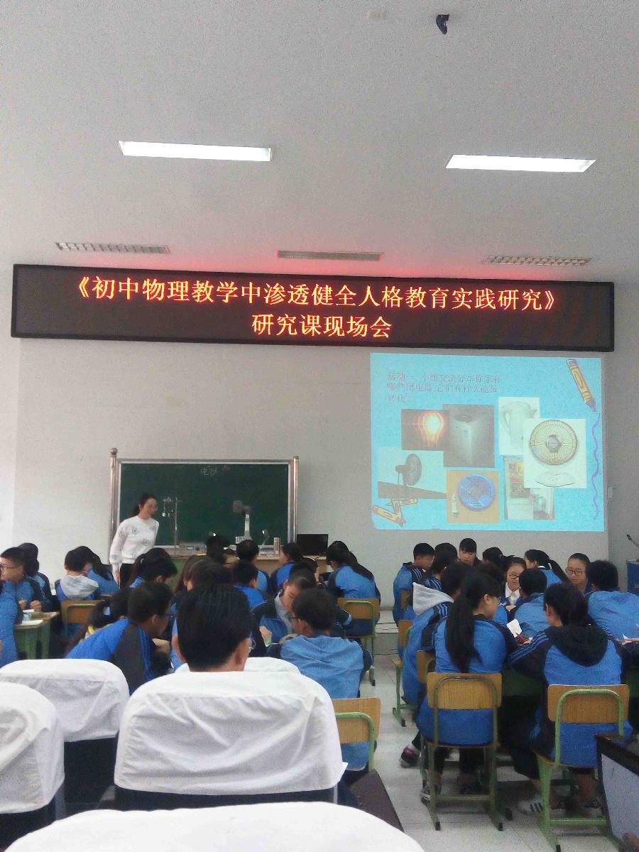 2015年11月5日,我校《初中物理教学中渗透健全人格教育实践研究》阶段成果汇报在学术厅举行,张校长到场参加。首先由物理组韩媛媛老师上了一堂课题展示课——《电功》。这堂课首先从学生熟悉的机械功引入,让学生对比理解电功,通过思考家用电器工作时能量事怎么转化的开展学生活动,充分调动了学生的积极性,进一步激发引领学生想要理解电功实质的兴趣。通过演示用电器短时间工作,电能表的示数无变化,启发学生思考如何测量用电器消耗的电能,培养了学生的创新精神和探究精神。最后通过学生讨论一度电的用处、如何节约用电,把整堂课推向了高潮。这堂课通过韩媛媛老师的精心设计和准备,将健全人格教育渗透于整个教学过程中。