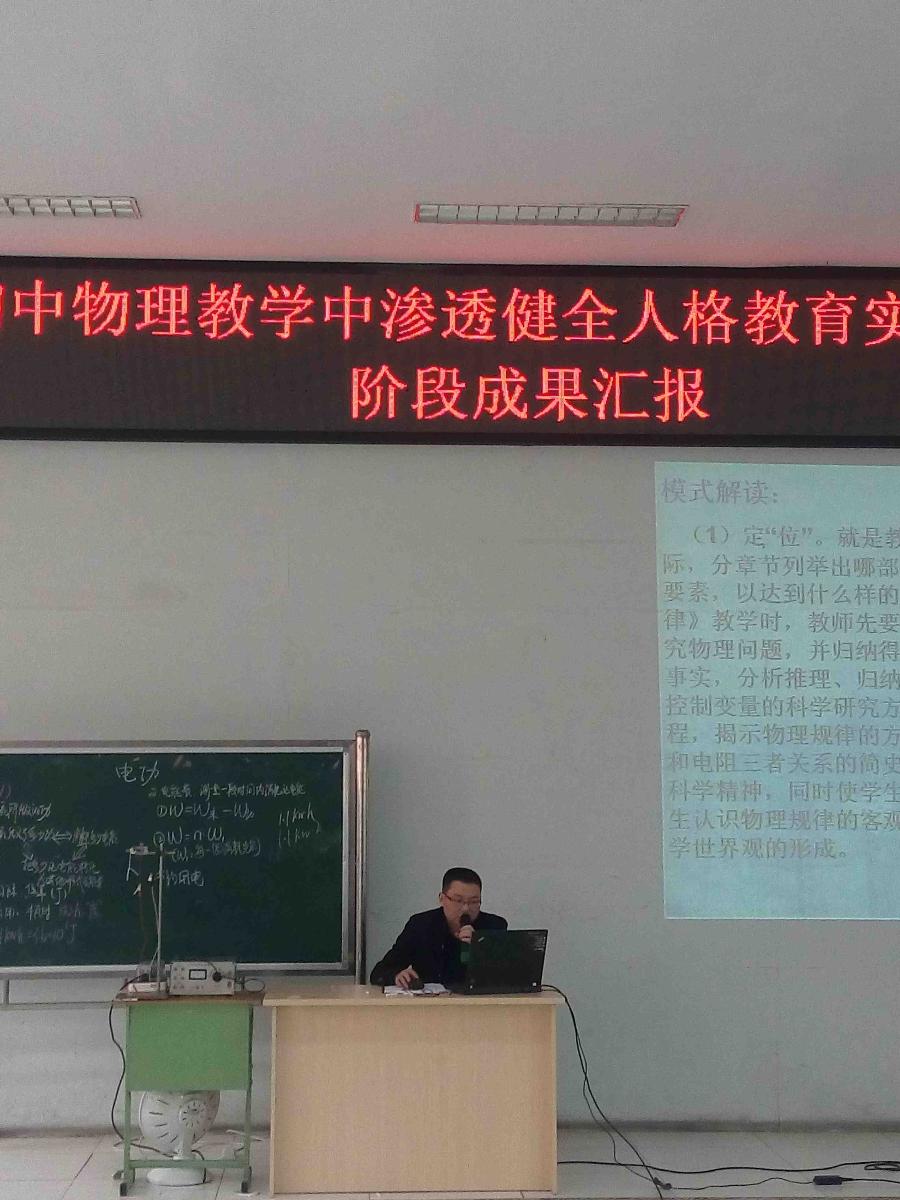 最后,由罗远洋老师代表我组进行了开展了《初中物理教学中渗透健全人格教育实践研究》阶段成果汇报。罗老师从该课题的研究目标、研究方向、研究措施和途径、阶段成果和效果、研究存在的主要问题、下阶段研究重点等方面进行了详细的阐述,确定了课题组在下阶段进行理论探讨和实证研究的方向。(物理组 刘曦萍)