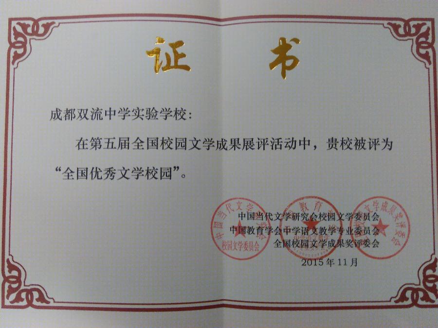 2015年11月6日至7日,由中国当代文学研究会校园文学委员会主办、中国教育学会中学语文教学专业委员会指导、陕西省西安中学承办的第五届全国校园文学研究高峰论坛暨全国校园文学成果展览会,在西安成功举办。著名文学评论家、中国当代文学研究会会长白烨,著名语文教学专家、中国教育学会中学语文教学专业委员会理事长、人民教育出版社语文教材编审顾之川,著名语文教学专家、中语会副理事长、中国教育科学研究院教授张鹏举,著名作家、陕西省文联副主席、陕西省作家协会副主席高建群,著名作家、陕西省作家协会副主席红柯,中国少年儿童新闻出版总社编审、叶圣陶孙女叶小沫,陕西省教学科学研究所所长李振东,陕西省西安中学校长、特级教师张克强,中国当代文学研究会校园文学委员会常务副会长、中语会理事王世龙以及来自全国各地的中小学校长、教师、教研人员300余人出席了本届论坛。