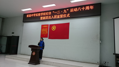 为纪念“12.9”学生爱国运动,激发学生的爱国热情,增强爱国意识,继承和发扬爱国主义精神,鼓励学生树立为报效国家和振兴中华民族而努力学习的远大志向, 12月8日,在学术厅隆重举行了纪念12•9运动八十周年活动暨新团员入团宣誓仪式,德育处王敏蓉副主任,团校委各位老师、部分校级学生干部和新入团同学参加了此次活动。